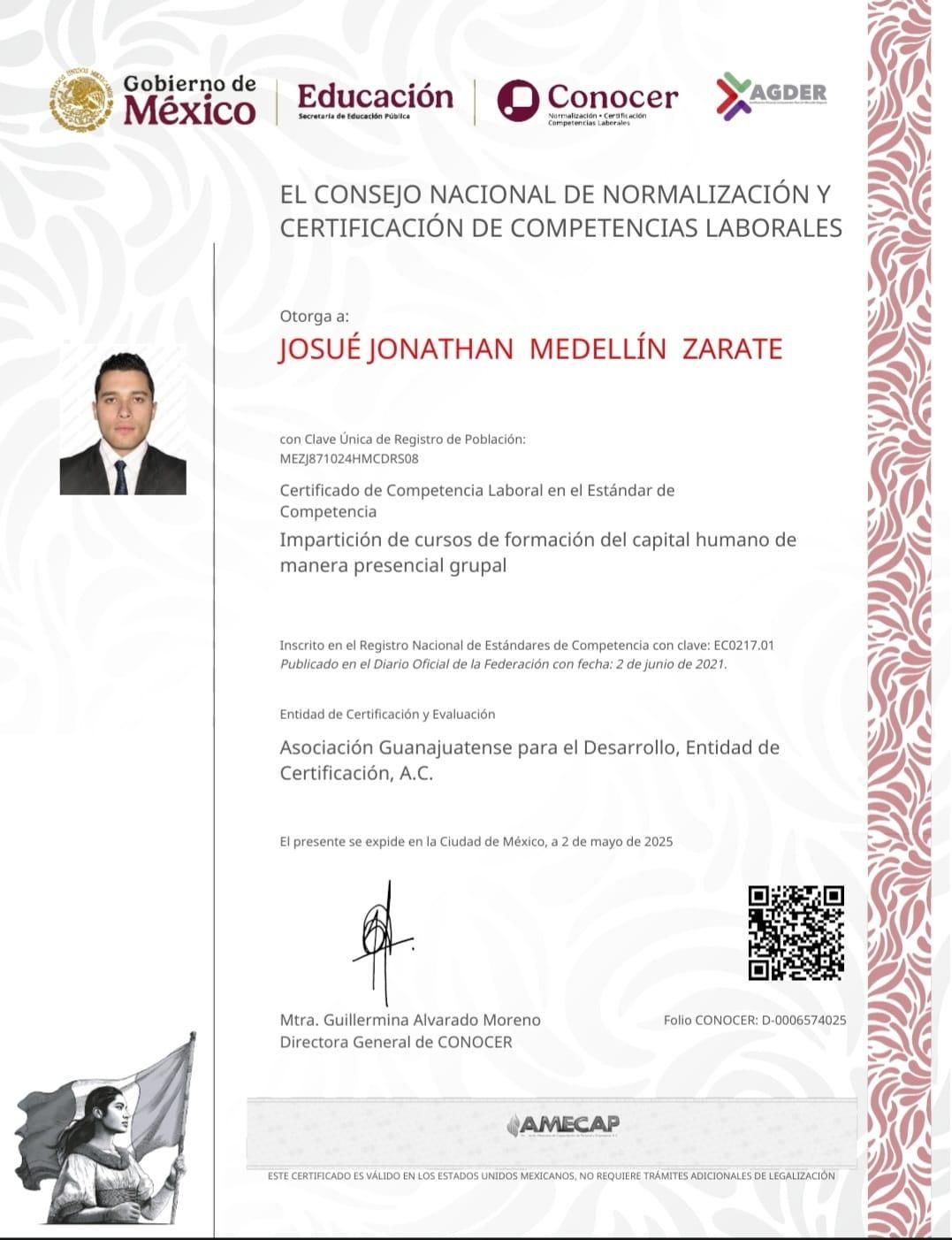 El instructor está certificado por Sep-Conocer como impartidor de cursos grupales en el standard EC0217.01 como garantía de un curso de calidad y avalado con las mejores competencias como capacitador.